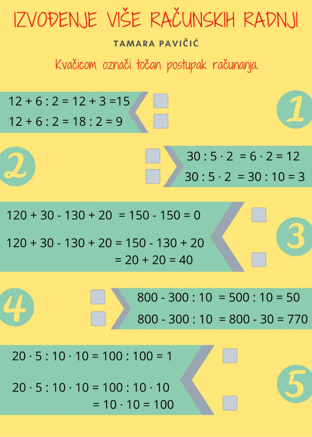 U svakom slučaju vrijedi isprobati, a ako savladate osnovne vještine rada sa LIVEWORKSHEETS uživaćete mnoge prednosti koje ovaj alat nudi u svom arsenalu mogućnosti. Danas vam predstavljamo rad učiteljice Tamare Pavičić koja je na svoj način osmislila “Izvođenje više računskih radnji”