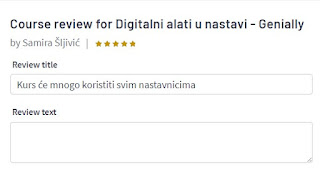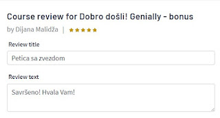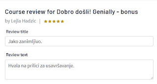“Kurs je odličan! U jednom dahu sam prešla današnje zadatke? Jako lijepo i postupno objašnjeno. Sve pohvale za dosadašnji rad.?”